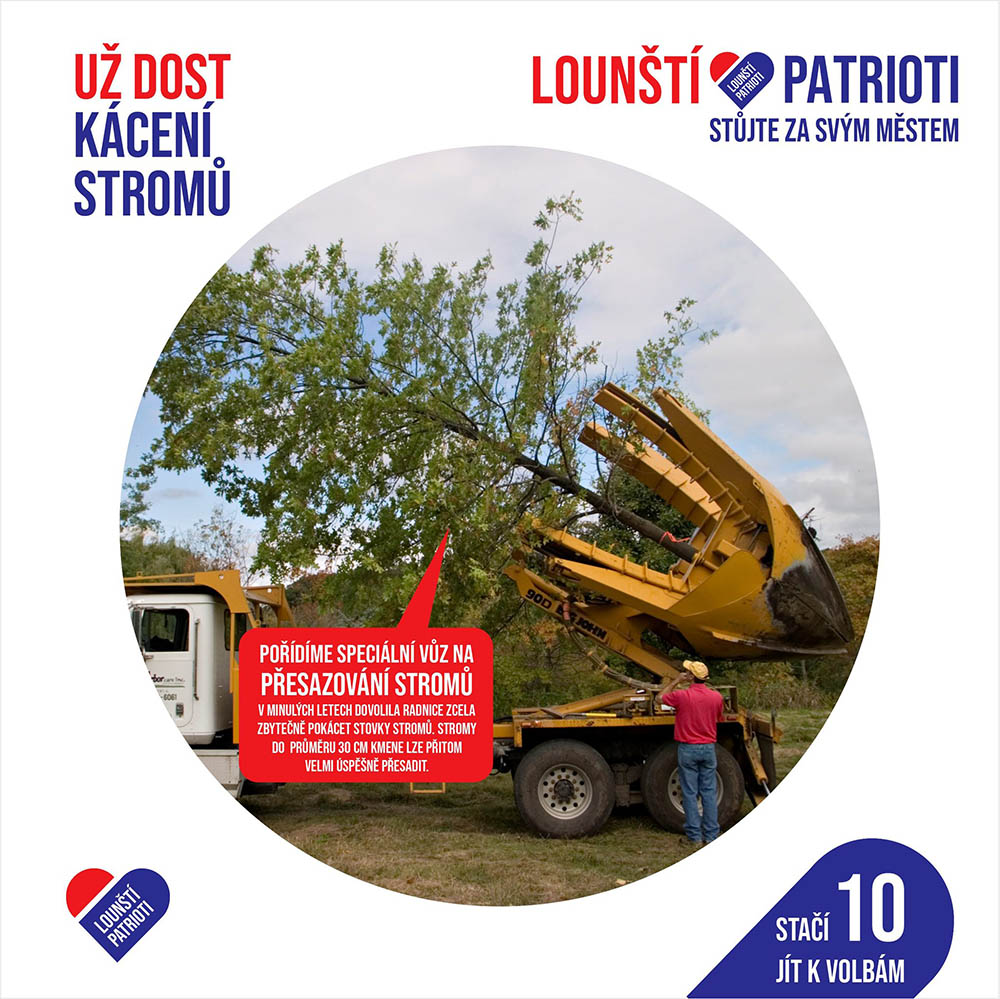 Pořídíme speciální vůz na přesazování stromů. V uplynulém volebním období dovolila radnice zbytečně pokácet stovky stromů. Stromy do průměru 30 cm kmene lze přitom velmi úspěšně přesadit. Založíme vlastní městskou lesní školku a budeme si pěstovat stromy, kterými osázíme celé Louny. Za každého žijícího i nově narozeného Louňáka tak postupně vysadíme strom. Vzpomínáte na sekání trávníků při nedělním obědě, ve vyprahlém létě nebo dokonce v zimě pod sněhem? Chceme ve městě zadržet vláhu i udržet biodiverzitu, minimalizujme sečení, kde to jen půjde chceme mít více luk než anglických trávníků. Vybudujeme záchytná místa na dešťovou vodu a s ní budeme uvážlivě hospodařit.